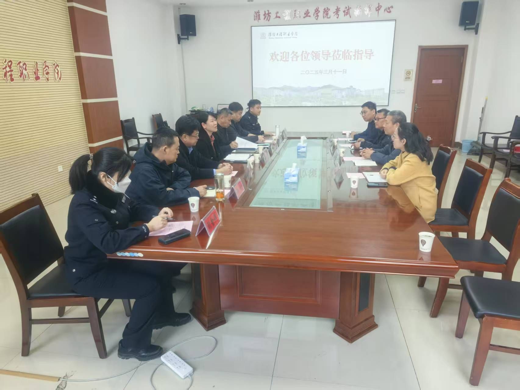 3月11日上午,潍坊市公安局政保支队副支队长张荣、潍坊市公安局政保支队三大队大队长赵北海、潍坊市公安局政保支队三大队副大队长于强、青州市公安局党委副书记吴传祥、青州市公安局政保大队大队长郝剑、青州市公安局风景区派出所所长王鑫、青州市公安局风景区派出所院校警务室民警张金蝉等一行7人来院调研指导,学院安全保卫处、宣传部、学生工作处、后勤服务处等单位负责同志参加了调研会议。